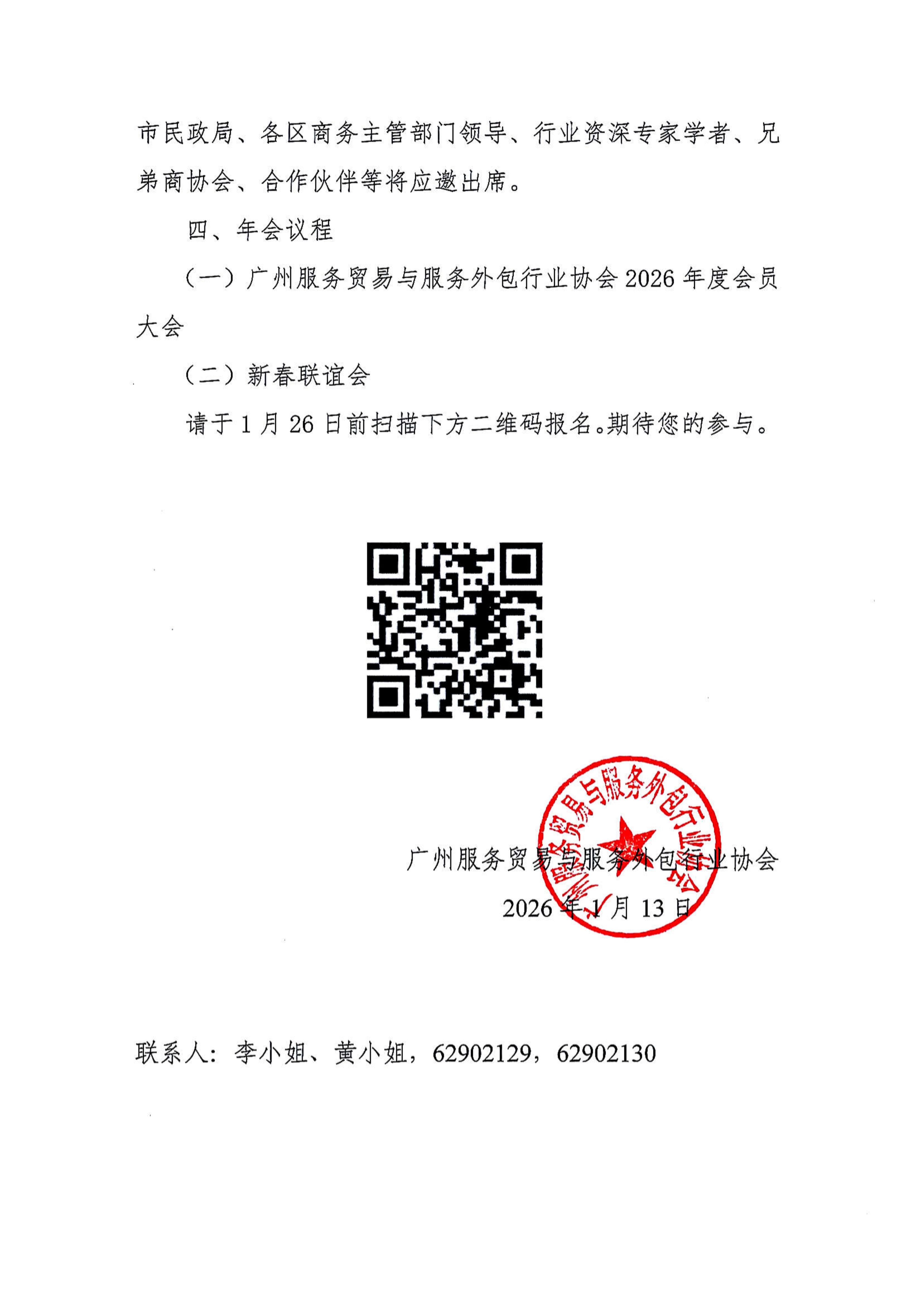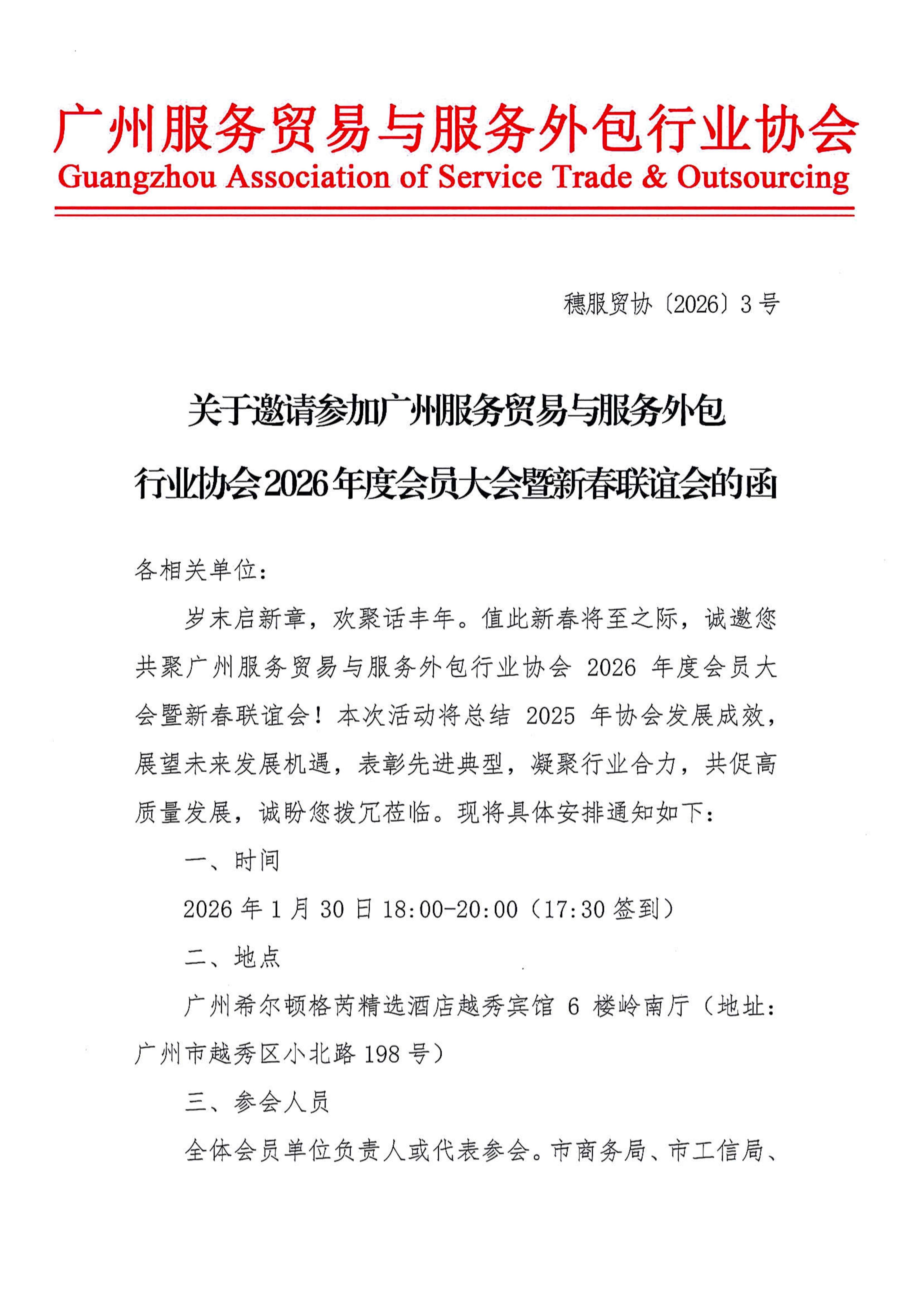 关于邀请参加广州服务贸易与服务外包行业协会2026年度会员大会暨新春联谊会的函